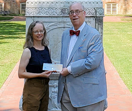 Below: Dr. Tuska Benes accepts the first grant check for the new Fellowship from General Society Tablets and Monuments Chair Channing Hall.